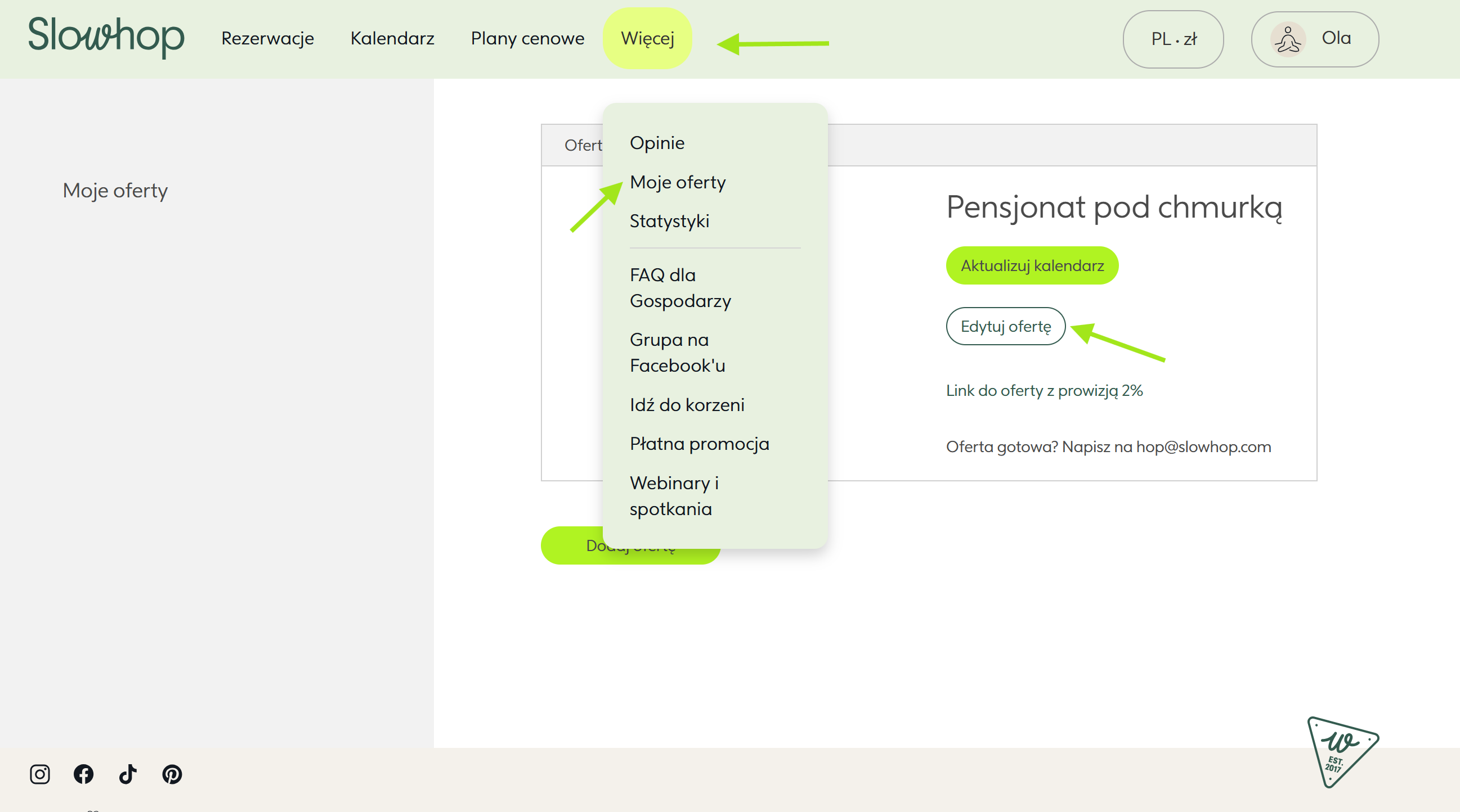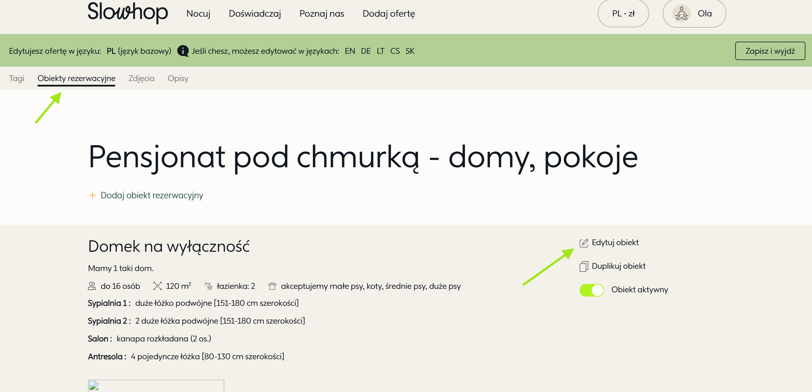 - Wybierz obiekt (np. domek na wyłączność) i kliknij „Edytuj obiekt”.