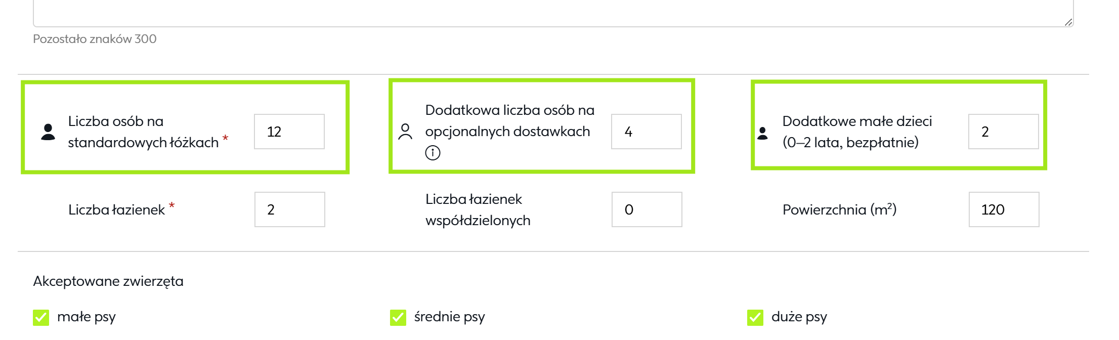 📌 Dane w tej sekcji wpływają na całkowitą pojemność obiektu oraz plan cenowy (w całkowitą pojemność nie wliczają się bezpłatne dzieci do 2 r.ż).