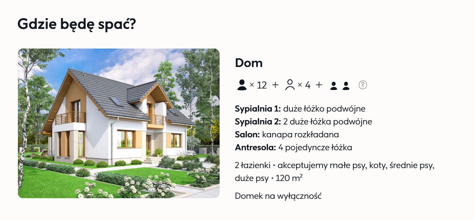 - 👤 Standardowe łóżka – liczba osób, które mogą spać w obiekcie na standardowych łóżkach (np. 12).
