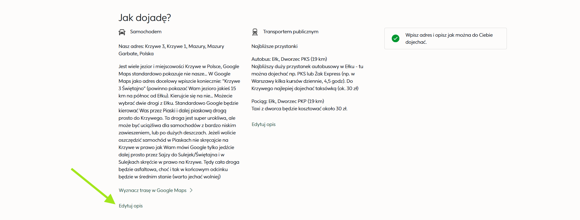 2. Zjedźcie do sekcji "Jak dojadę?" i kliknijcie w link "Edytuj opis" na samym dole sekcji