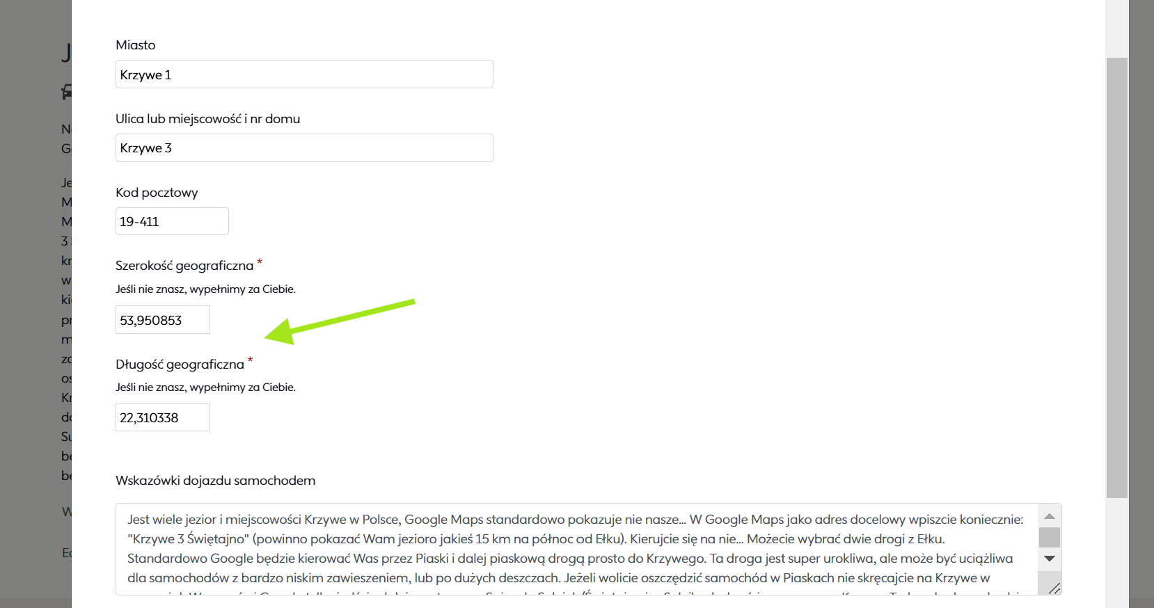 - koordynaty powinny być wpisane w formacie liczby przedzielonej kropką, bez żadnych liter: "xx.xxxxx"