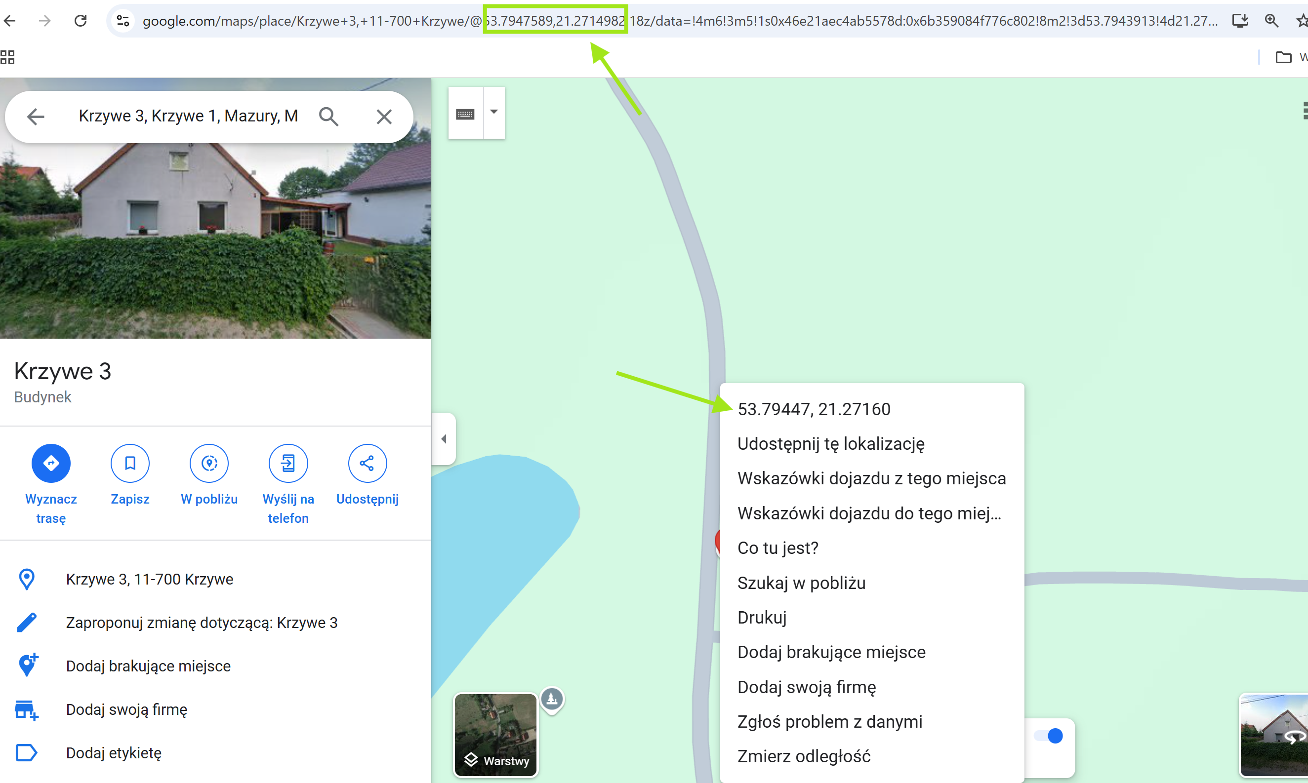 Klikając na bryle budynku znajdziecie idealne koordynaty GPS. Można je też podpatrzyć w adresie URL z Google Maps.